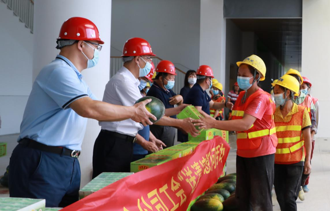 在項目現(xiàn)場,慰問組一行與項目負責(zé)人深入交流,詳細了解一線職工工生產(chǎn)生活情況,現(xiàn)場查看施工安全生產(chǎn)、勞動保護和防暑降溫措施,并送上清涼飲料等慰問品。