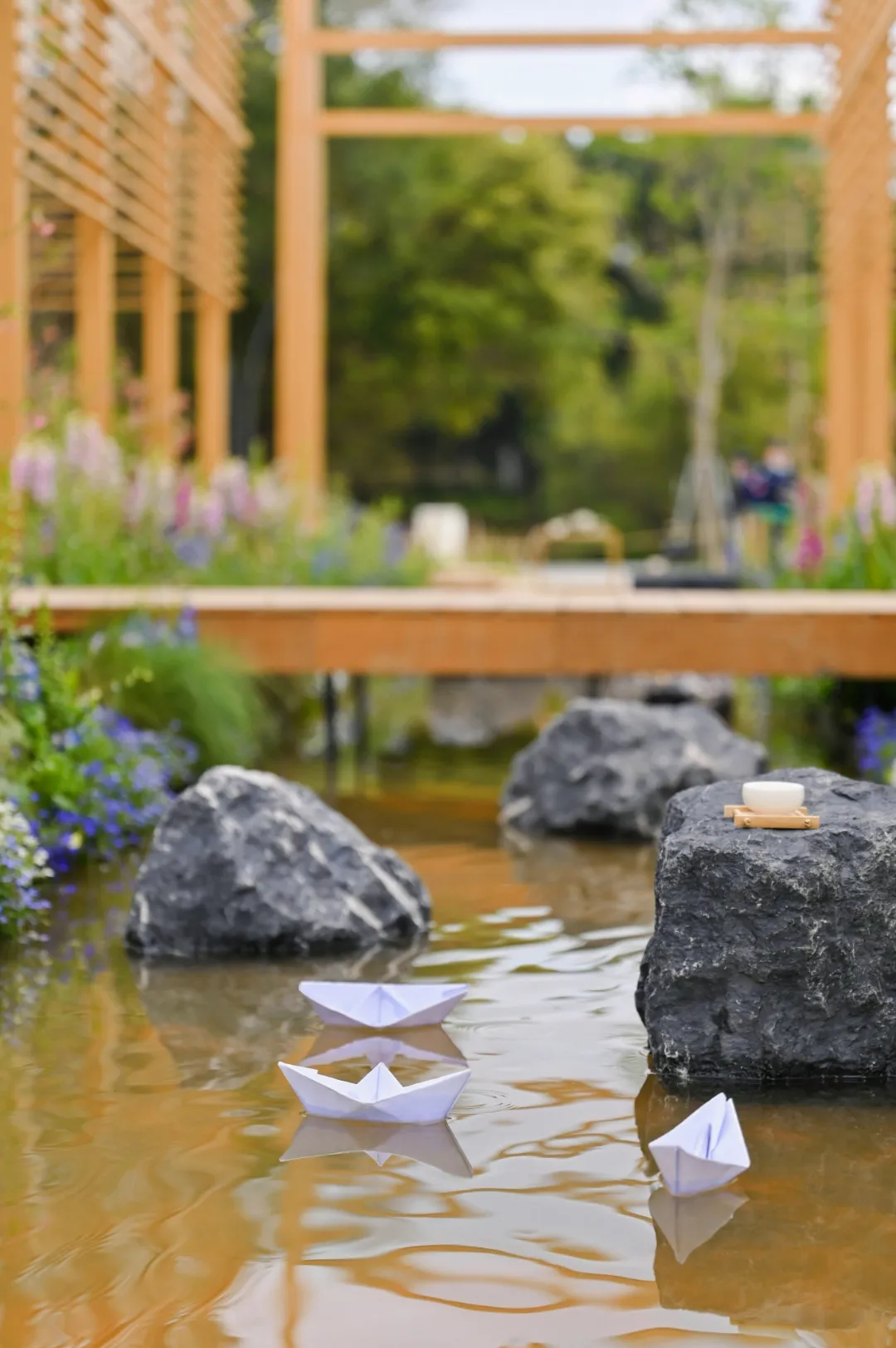 橫琴是一座生態(tài)島嶼,水元素代表了橫琴的歷史文化背景,循環(huán)互動(dòng)裝置中的紙船象征著曾經(jīng)的小漁船發(fā)展成為中國(guó)式現(xiàn)代化建設(shè)中揚(yáng)帆起航的大船,在高速發(fā)展的同時(shí),追本溯源,不忘初心。