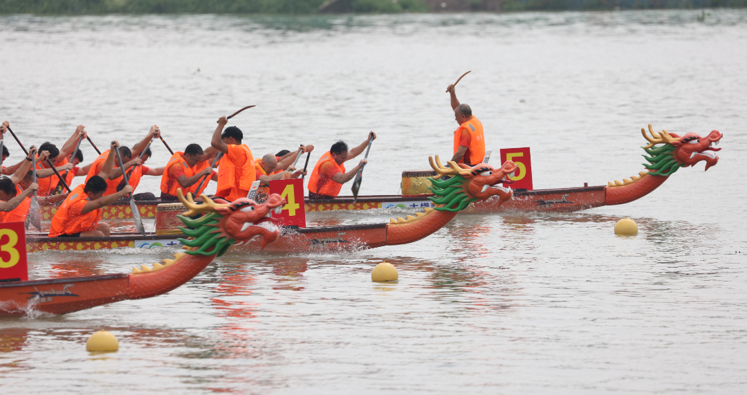 “嗶!”發(fā)令聲響,比賽正式開(kāi)始。一條條龍舟破水而出,沿著600米的賽道,各組隊(duì)伍奮力揮槳、劈波斬浪,在一聲聲吶喊中奮勇向前,激起層層浪花。