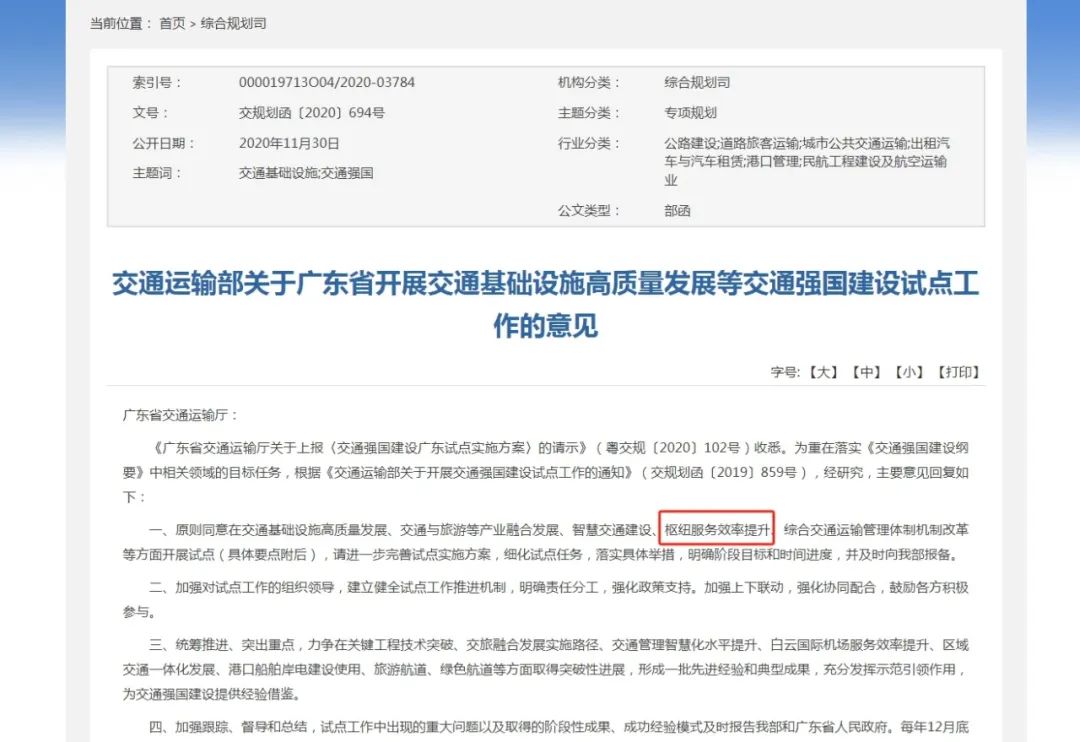 2020年10月10日,交通運(yùn)輸部將“樞紐服務(wù)效率提升”列為廣東省承擔(dān)的全國(guó)交通強(qiáng)國(guó)建設(shè)試點(diǎn)任務(wù)之一,包括提升口岸通關(guān)便利化水平、提升白云機(jī)場(chǎng)國(guó)際航空樞紐輻射能力、提升港口智慧綠色發(fā)展水平三塊板塊。