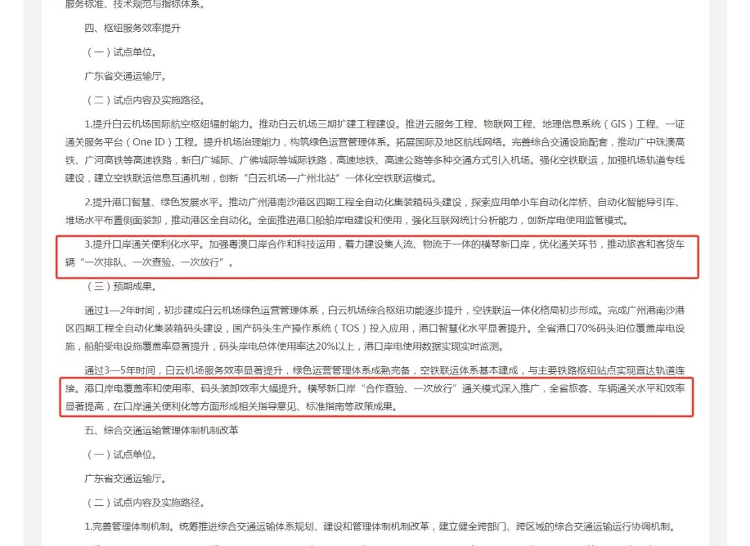 預(yù)期通過(guò)3—5年時(shí)間,實(shí)現(xiàn)白云機(jī)場(chǎng)服務(wù)效率顯著提升,綠色運(yùn)營(yíng)管理體系成熟完備,空鐵聯(lián)運(yùn)體系基本建成,與主要鐵路樞紐站點(diǎn)實(shí)現(xiàn)直達(dá)軌道連接;港口岸電覆蓋率和使用率、碼頭裝卸效率大幅提升;橫琴口岸“合作查驗(yàn)、一次放行”通關(guān)模式深入推廣,全省旅客、車(chē)輛通關(guān)水平和效率顯著提高,在口岸通關(guān)便利化等方面形成相關(guān)指導(dǎo)意見(jiàn)、標(biāo)準(zhǔn)指南等政策成果。