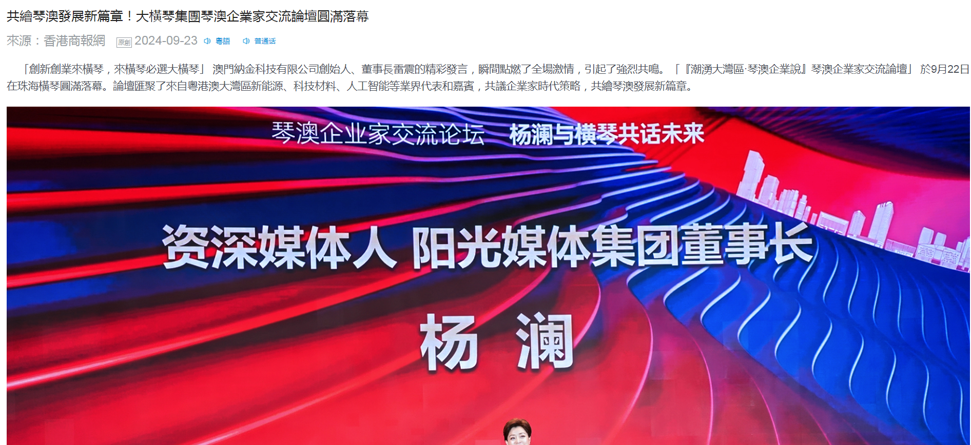 「創(chuàng)新創(chuàng)業(yè)來橫琴,來橫琴必選大橫琴」 澳門納金科技有限公司創(chuàng)始人、董事長雷震的精彩發(fā)言,瞬間點(diǎn)燃了全場激情,引起了強(qiáng)烈共鳴。「『潮湧大灣區(qū)·琴澳企業(yè)說』琴澳企業(yè)家交流論壇」 於9月22日在珠海橫琴圓滿落幕。論壇匯聚了來自粵港澳大灣區(qū)新能源、科技材料、人工智能等業(yè)界代表和嘉賓,共議企業(yè)家時(shí)代策略,共繪琴澳發(fā)展新篇章。
