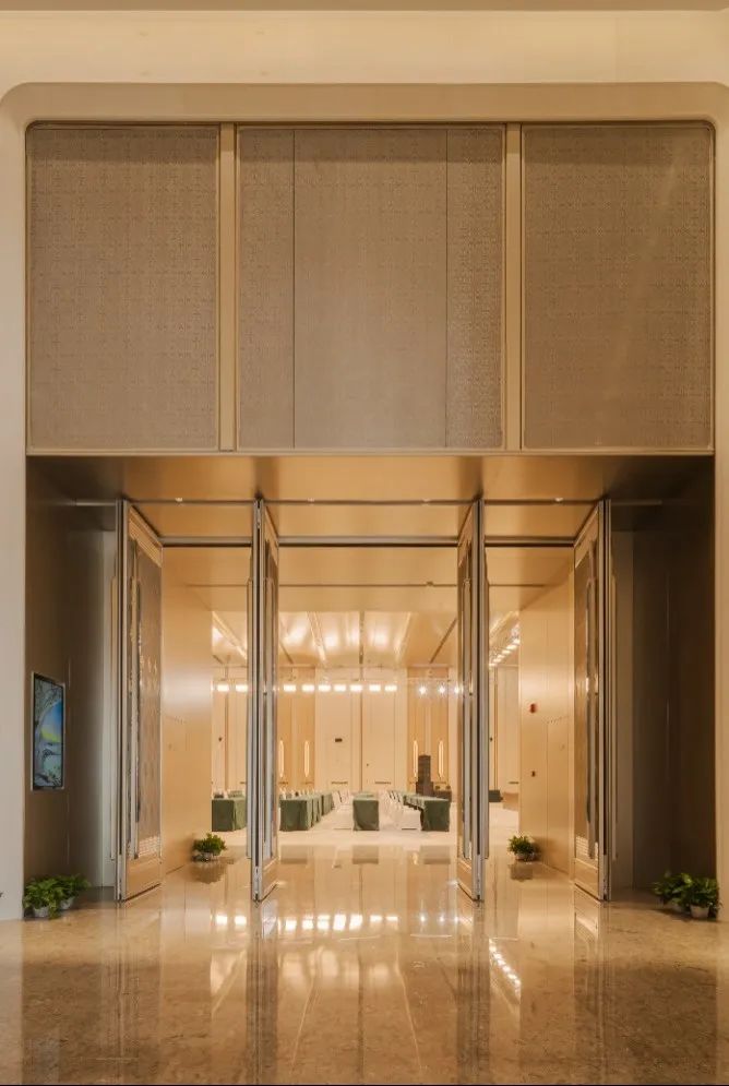 會(huì)議中心前廳頂面采用25朵花代表澳門回歸祖國(guó)25周年,造型中提取木棉花、蓮花寫意形體作為裝飾元素,圖案相互交錯(cuò),寓意“一國(guó)兩制”方針下粵澳共商、共建、共管、共享的新模式。