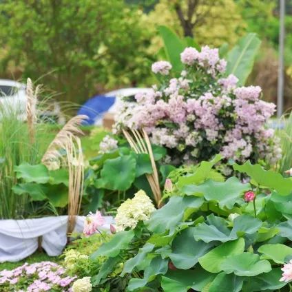 展園整體以典雅氛圍為基調,白荷花與藍紫色的百子蓮則為點睛之筆,形成視覺焦點,現代素材與傳統(tǒng)意境相互碰撞,打造清新與浪漫的場景。