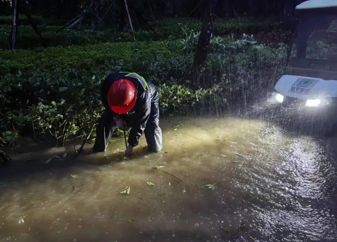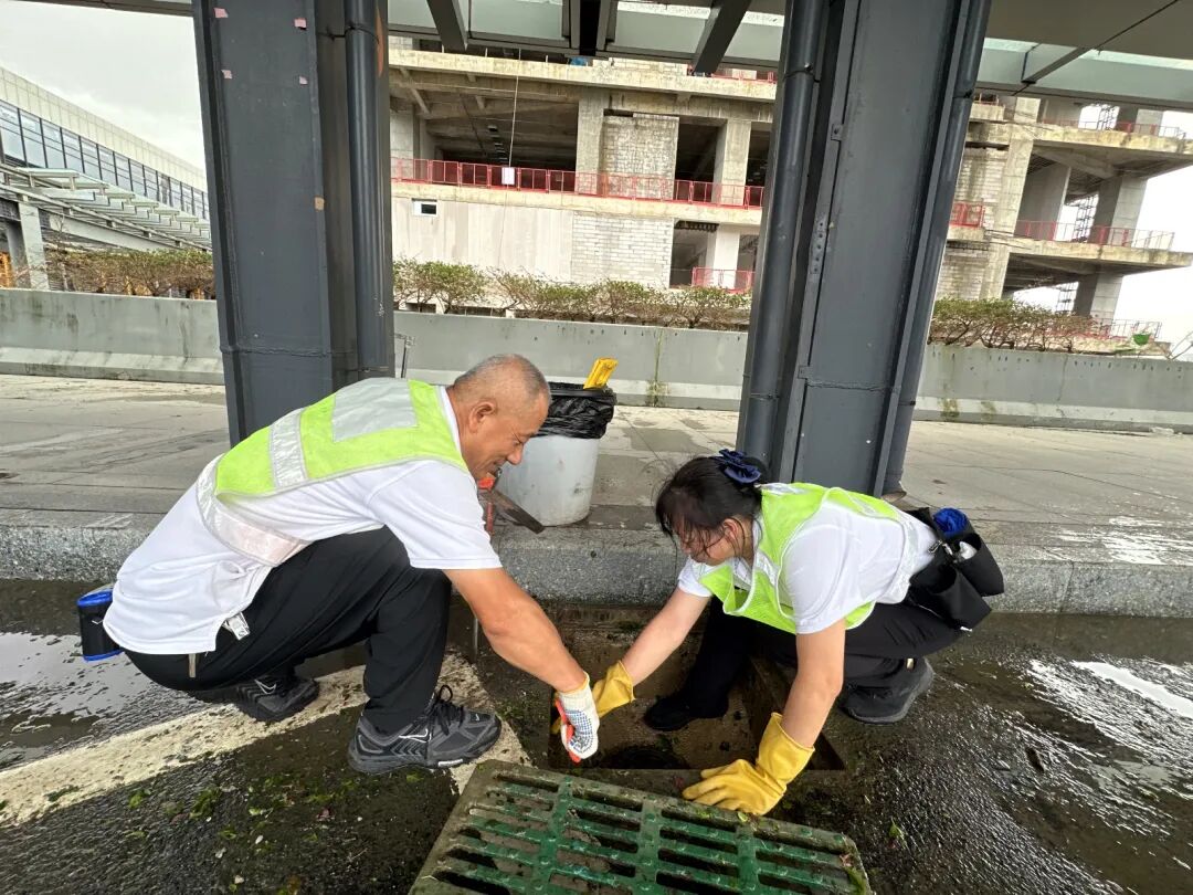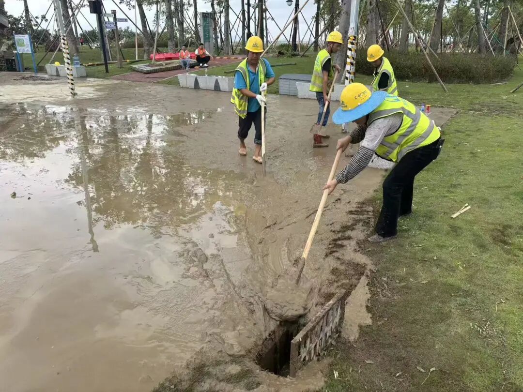 臺(tái)風(fēng)期間,受風(fēng)暴潮影響,橫琴天沐河水位上漲,珠光集團(tuán)迅速組織搶險(xiǎn)力量,通過(guò)加筑沙袋有效阻止海水倒灌進(jìn)天沐河,同步安全轉(zhuǎn)移設(shè)備設(shè)施,并緊急安裝抽水設(shè)備清理積水,避免變電房被水浸泡。臺(tái)風(fēng)過(guò)境后,搶險(xiǎn)隊(duì)伍立即投入后續(xù)清理工作,第一時(shí)間清理泵站進(jìn)水口垃圾,保障泵站排水通暢,降低村渠水位;清理排水口垃圾,保障土渠排水暢通;并全力協(xié)助合作區(qū)市政管理署,清理倒塌的邊境圍網(wǎng)。