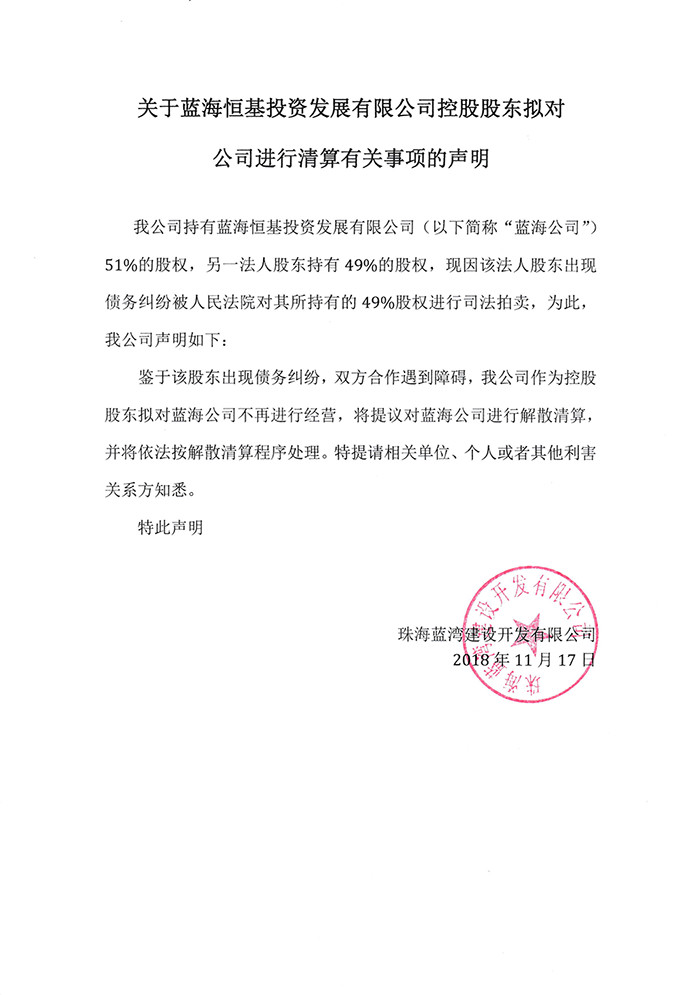 關于藍海恒基投資發(fā)展有限公司控股股東擬對公司進行清算有關事項的聲明